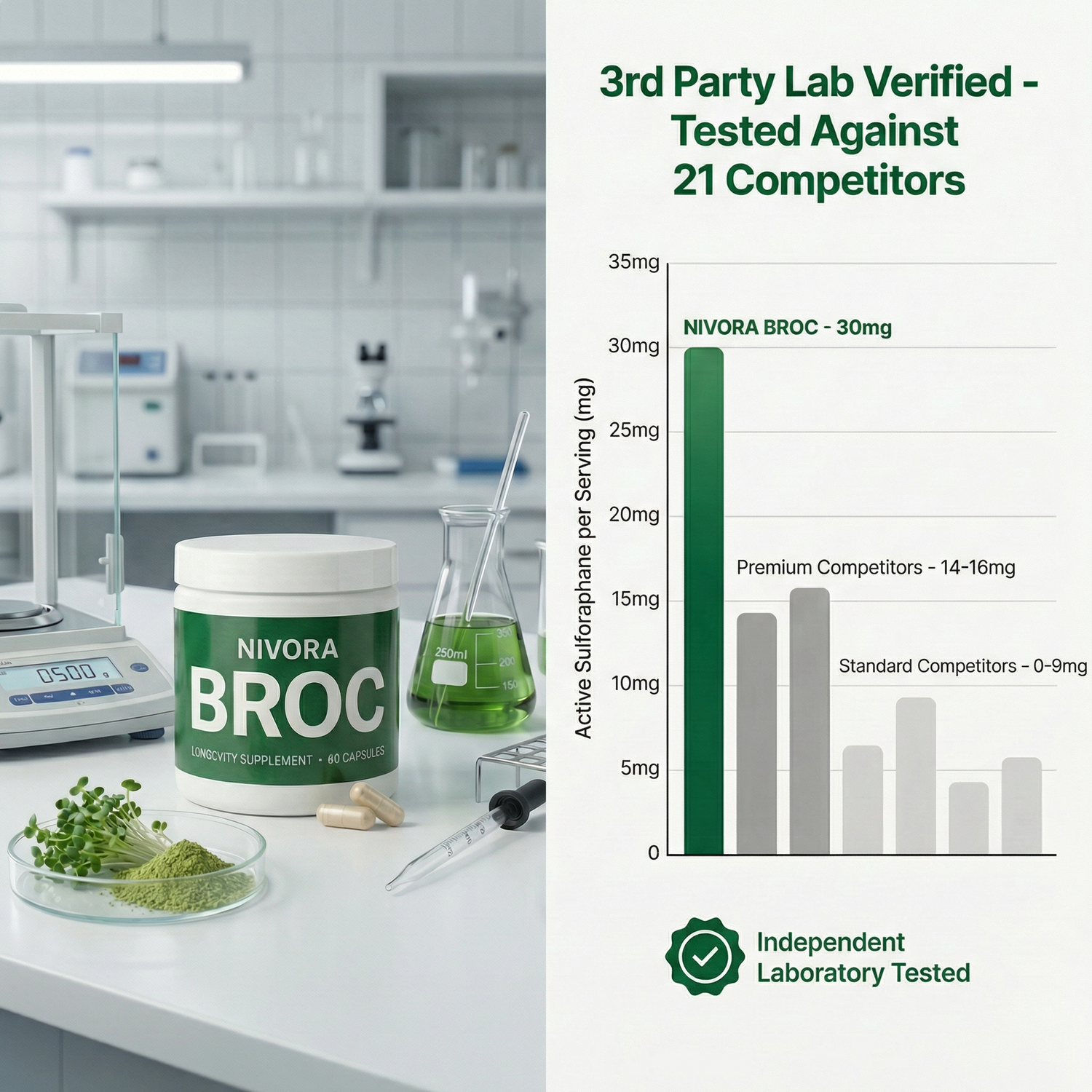 Third-party labs compare BROC against 21 leading sulforaphane supplements. The results are published: our proprietary seeds deliver 30mg of bioavailable sulforaphane—more than any product tested.