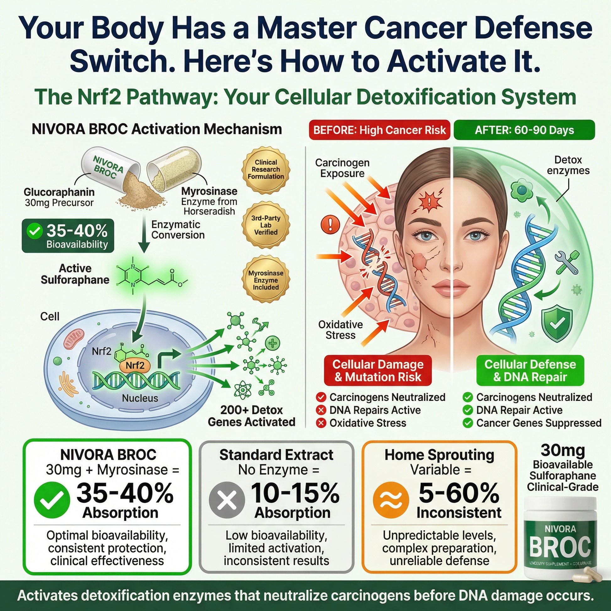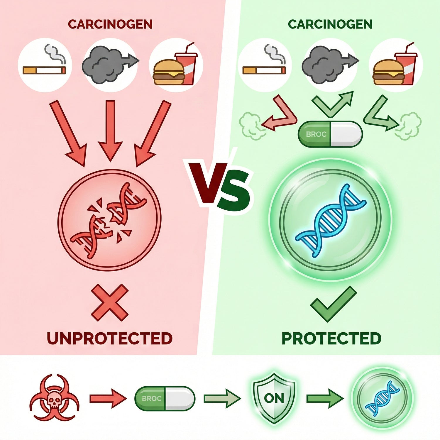 Every day, carcinogens from food, air, and environment enter your body. Your cells have a defense system designed to neutralize these threats before they damage DNA—but it needs to be activated.