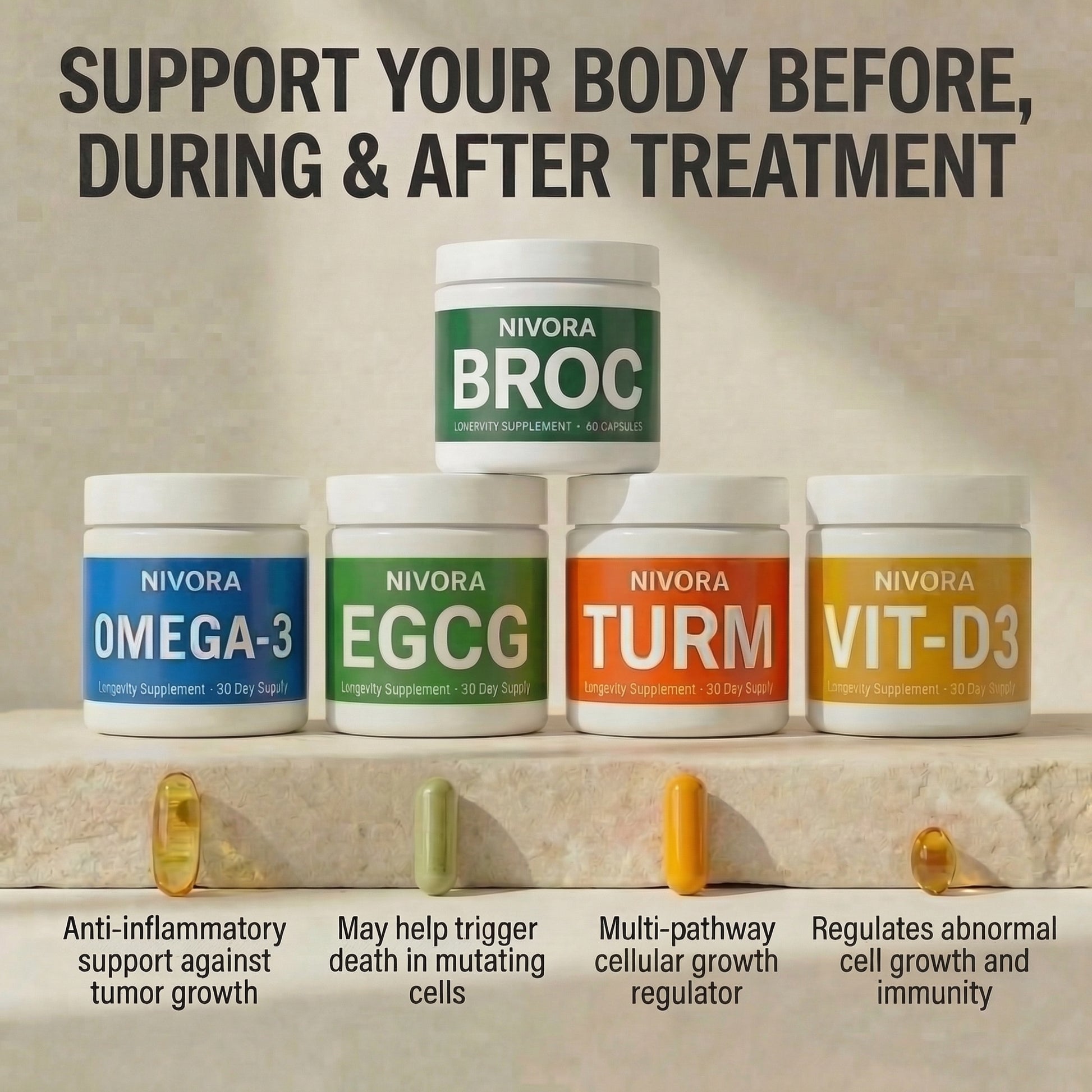 The Stack closes every gap: TURM may suppress inflammation, OMEGA-3 may create an anti-inflammatory environment, VIT-D3 may control cell growth and immune function, and EGCG may destroy mutating cells. Comprehensive cellular defense from every angle.